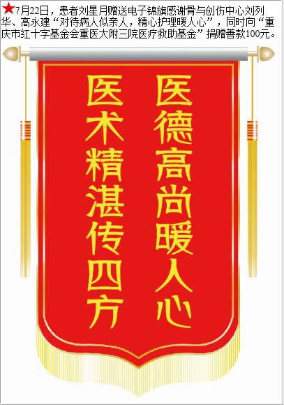 患者刘星月赠送电子锦旗感谢骨与创伤中心刘列华等人,并向医疗救助基金捐赠善款100元。-锦旗-患者心声-患者服务-重庆医科大学附属第三医院【官方网站】