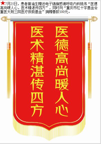 患者曾渝生赠送电子锦旗感谢呼吸内科姚伟,并向医疗救助基金捐赠善款100元。-锦旗-患者心声-患者服务-重庆医科大学附属第三医院【官方网站】