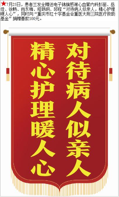 患者兰发全赠送电子锦旗感谢心血管内科彭丽等人,并向医疗救助基金捐赠善款100元。-锦旗-患者心声-患者服务-重庆医科大学附属第三医院【官方网站】