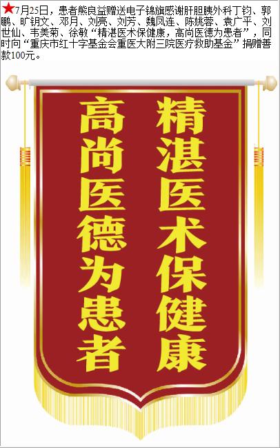 患者熊良益赠送电子锦旗感谢肝胆胰外科丁钧等人,并向医疗救助基金捐赠善款100元。-锦旗-患者心声-患者服务-重庆医科大学附属第三医院【官方网站】