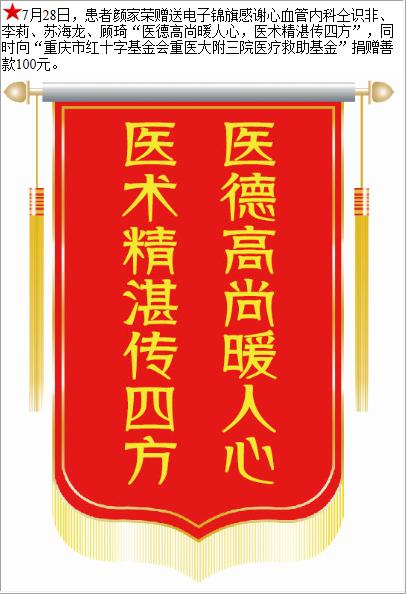 患者颜家荣赠送电子锦旗感谢心血管内科仝识非等人,并向医疗救助基金捐赠善款100元。-锦旗-患者心声-患者服务-重庆医科大学附属第三医院【官方网站】