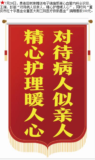 患者田树泉赠送电子锦旗感谢心血管内科仝识非等人,并向医疗救助基金捐赠善款100元。-锦旗-患者心声-患者服务-重庆医科大学附属第三医院【官方网站】