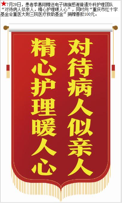 患者季惠翔赠送电子锦旗感谢普通外科护理团队,并向医疗救助基金捐赠善款100元。-锦旗-患者心声-患者服务-重庆医科大学附属第三医院【官方网站】