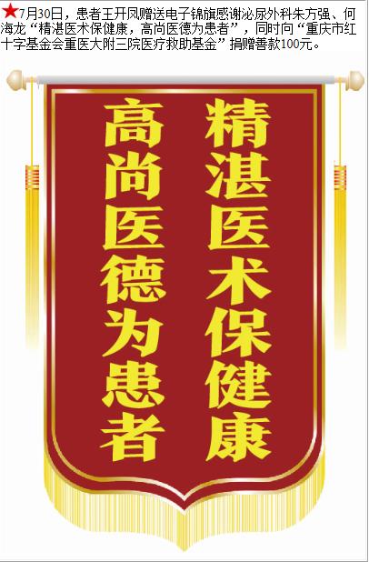 患者王开凤赠送电子锦旗感谢泌尿外科朱方强等人,并向医疗救助基金捐赠善款100元。-锦旗-患者心声-患者服务-重庆医科大学附属第三医院【官方网站】