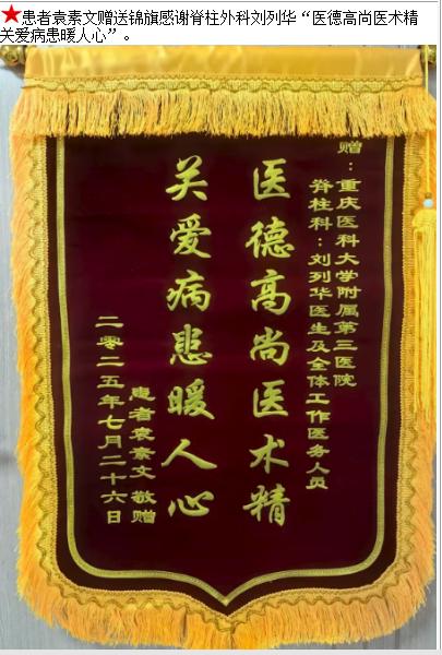 患者袁素文赠送锦旗感谢脊柱外科刘列华等人。-锦旗-患者心声-患者服务-重庆医科大学附属第三医院【官方网站】