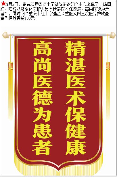 患者邓月赠送电子锦旗感谢妇产中心李真子等人,并向医疗救助基金捐赠善款100元。-锦旗-患者心声-患者服务-重庆医科大学附属第三医院【官方网站】