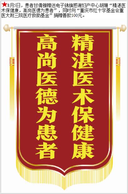 患者甘倩雅赠送电子锦旗感谢妇产中心胡珊,并向医疗救助基金捐赠善款100元。-锦旗-患者心声-患者服务-重庆医科大学附属第三医院【官方网站】