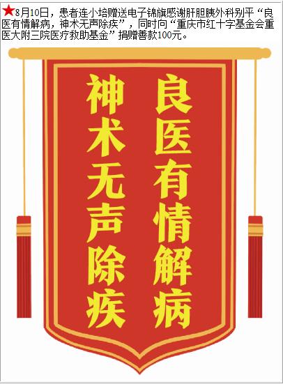患者连小培赠送电子锦旗感谢肝胆胰外科别平,并向医疗救助基金捐赠善款100元。-锦旗-患者心声-患者服务-重庆医科大学附属第三医院【官方网站】