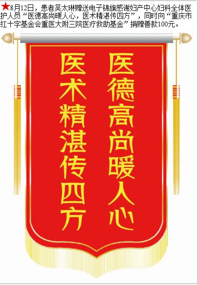 患者吴太琳赠送电子锦旗感谢妇产中心妇科全体医护人员,并向医疗救助基金捐赠善款100元。-锦旗-患者心声-患者服务-重庆医科大学附属第三医院【官方网站】