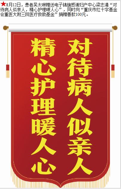 患者吴太琳赠送电子锦旗感谢妇产中心梁志清,并向医疗救助基金捐赠善款100元。-锦旗-患者心声-患者服务-重庆医科大学附属第三医院【官方网站】