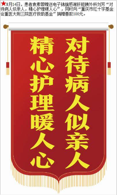 患者袁素蓉赠送电子锦旗感谢肝胆胰外科刘芳,并向医疗救助基金捐赠善款100元。-锦旗-患者心声-患者服务-重庆医科大学附属第三医院【官方网站】