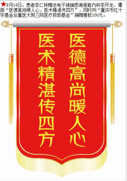 患者李仁林赠送电子锦旗感谢肾脏内科李开龙等人,并向医疗救助基金捐赠善款100元。-锦旗-患者心声-患者服务-重庆医科大学附属第三医院【官方网站】