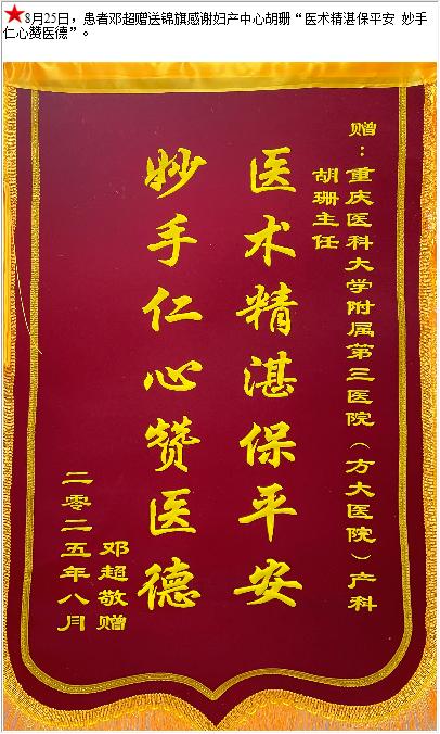 患者邓超赠送锦旗感谢妇产中心胡珊。-锦旗-患者心声-患者服务-重庆医科大学附属第三医院【官方网站】