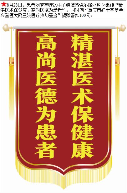 患者刘梦宇赠送电子锦旗感谢泌尿外科季惠翔,并向医疗救助基金捐赠善款100元。-锦旗-患者心声-患者服务-重庆医科大学附属第三医院【官方网站】