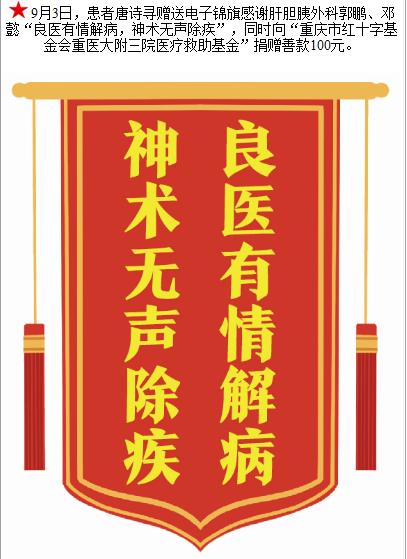 患者唐诗寻赠送电子锦旗感谢肝胆胰外科郭鹏,并向医疗救助基金捐赠善款100元。-锦旗-患者心声-患者服务-重庆医科大学附属第三医院【官方网站】