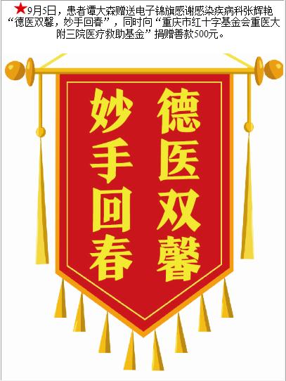 患者谭大森赠送电子锦旗感谢感染疾病科张辉艳,并向医疗救助基金捐赠善款500元。-锦旗-患者心声-患者服务-重庆医科大学附属第三医院【官方网站】