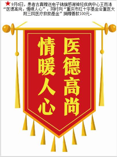 患者古真赠送电子锦旗感谢神经疾病中心王雨涛,并向医疗救助基金捐赠善款100元。-锦旗-患者心声-患者服务-重庆医科大学附属第三医院【官方网站】