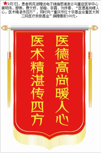 患者杨克波赠送电子锦旗感谢急诊与重症医学中心龚明伟等人,并向医疗救助基金捐赠善款100元。-锦旗-患者心声-患者服务-重庆医科大学附属第三医院【官方网站】
