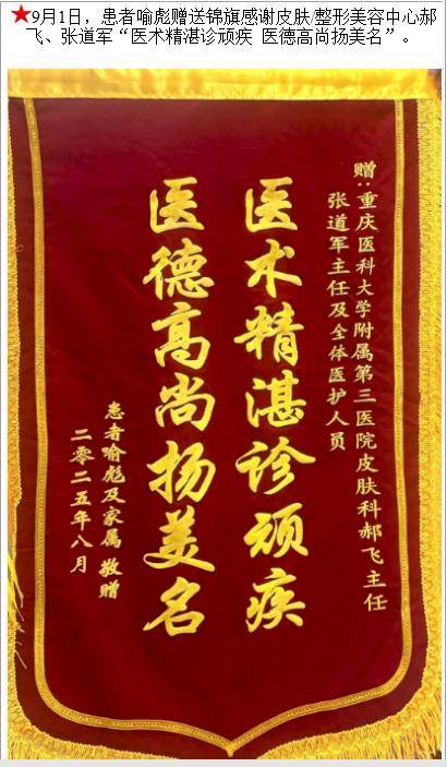患者喻彪赠送锦旗感谢皮肤/整形美容中心郝飞等人。-锦旗-患者心声-患者服务-重庆医科大学附属第三医院【官方网站】