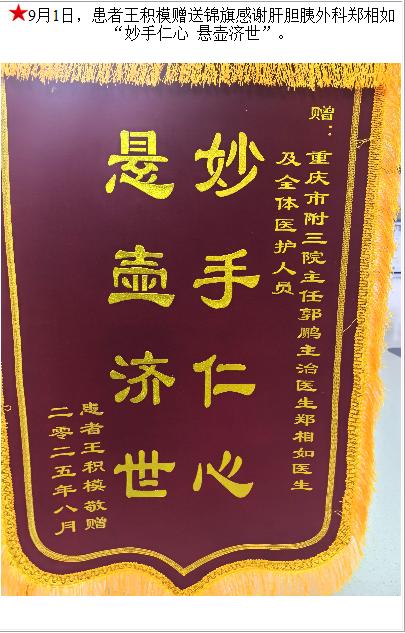 患者王积模赠送锦旗感谢肝胆胰外科郑相如。-锦旗-患者心声-患者服务-重庆医科大学附属第三医院【官方网站】
