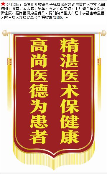 患者刘能赠送电子锦旗感谢急诊与重症医学中心闫柏刚等人,并向医疗救助基金捐赠100元。-锦旗-患者心声-患者服务-重庆医科大学附属第三医院【官方网站】