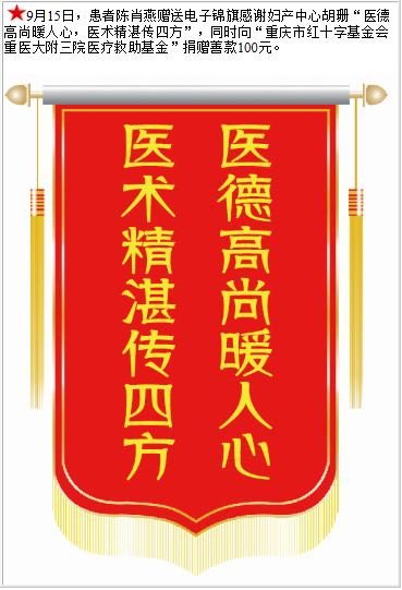 患者陈肖燕赠送电子锦旗感谢妇产中心胡珊,并向医疗救助基金捐赠善款100元。-锦旗-患者心声-患者服务-重庆医科大学附属第三医院【官方网站】
