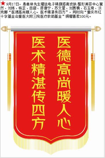 患者林先生赠送电子锦旗感谢皮肤/整形美容中心冀然等人,并向医疗救助基金捐赠善款100元。-锦旗-患者心声-患者服务-重庆医科大学附属第三医院【官方网站】