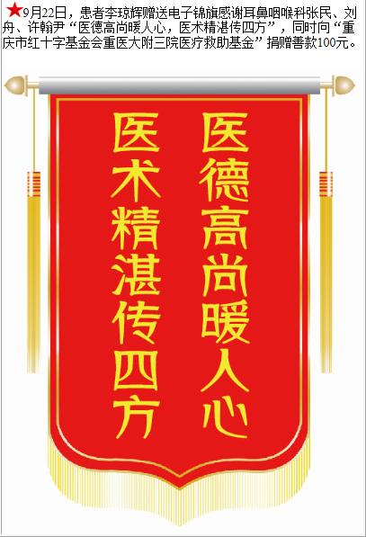 患者李琼辉赠送电子锦旗感谢耳鼻咽喉科张民等人,并向医疗救助基金捐赠善款100元。-锦旗-患者心声-患者服务-重庆医科大学附属第三医院【官方网站】