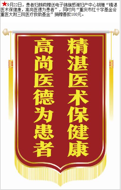 患者妇颜莉赠送电子锦旗感谢妇产中心胡珊,并向医疗救助基金捐赠善款100元。-锦旗-患者心声-患者服务-重庆医科大学附属第三医院【官方网站】