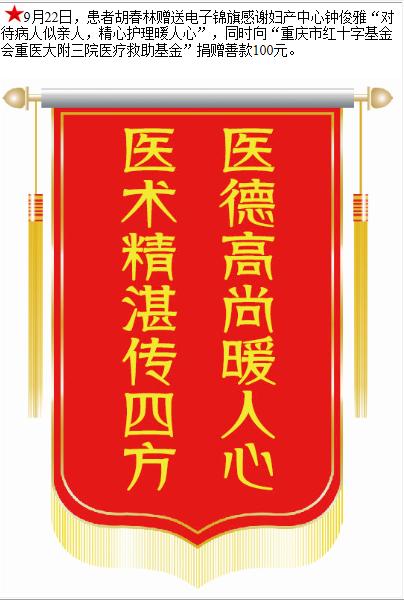 患者胡春林赠送电子锦旗感谢妇产中心钟俊雅,并向医疗救助基金捐赠善款100元。-锦旗-患者心声-患者服务-重庆医科大学附属第三医院【官方网站】