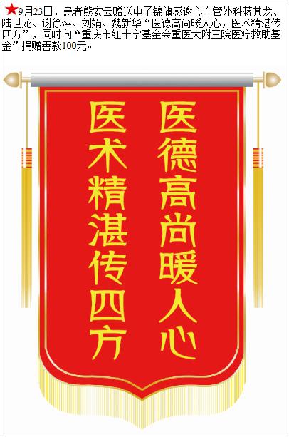 患者熊安云赠送电子锦旗感谢心血管外科蒋其龙等人,并向医疗救助基金捐赠善款100元。-锦旗-患者心声-患者服务-重庆医科大学附属第三医院【官方网站】