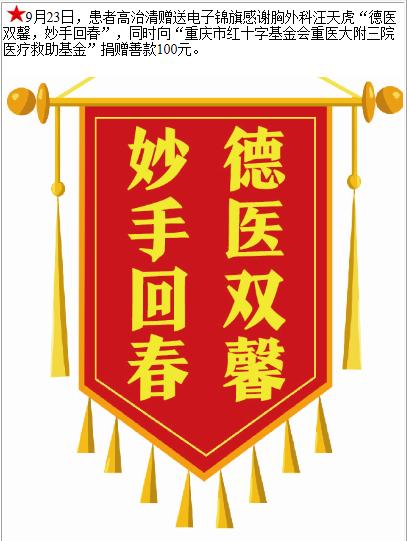 患者高治清赠送电子锦旗感谢胸外科汪天虎,并向医疗救助基金捐赠善款100元。-锦旗-患者心声-患者服务-重庆医科大学附属第三医院【官方网站】