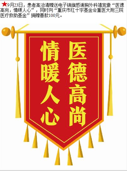 患者高治清赠送电子锦旗感谢胸外科靖宽豪,并向医疗救助基金捐赠善款100元。-锦旗-患者心声-患者服务-重庆医科大学附属第三医院【官方网站】