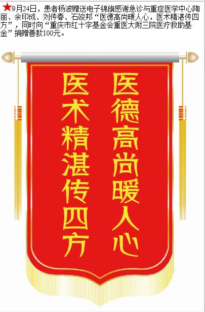 患者杨波赠送电子锦旗感谢急诊与重症医学中心陶丽等人,并向医疗救助基金捐赠善款100元。-锦旗-患者心声-患者服务-重庆医科大学附属第三医院【官方网站】