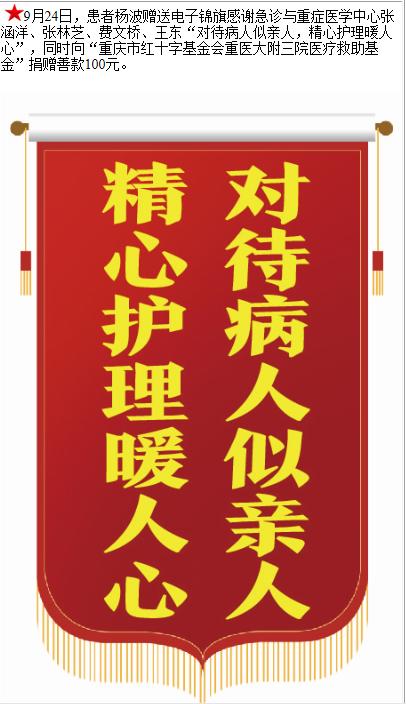 患者杨波赠送电子锦旗感谢急诊与重症医学中心张涵洋等人,并向医疗救助基金捐赠善款100元。-锦旗-患者心声-患者服务-重庆医科大学附属第三医院【官方网站】