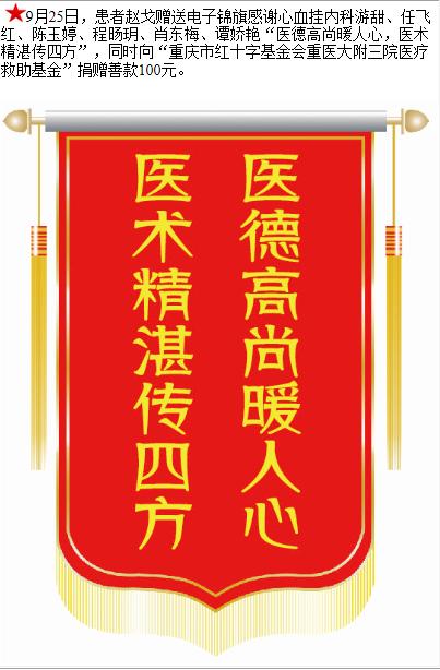 患者赵戈赠送电子锦旗感谢心血挂内科游甜等人,并向医疗救助基金捐赠善款100元。-锦旗-患者心声-患者服务-重庆医科大学附属第三医院【官方网站】