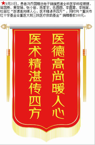 患者冯乔国赠送电子锦旗感谢全科医学科程媛媛等人,并向医疗救助基金捐赠善款100元。-锦旗-患者心声-患者服务-重庆医科大学附属第三医院【官方网站】
