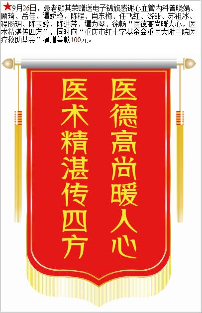 患者颜其荣赠送电子锦旗感谢心血管内科曾晓娟等人,并向医疗救助基金捐赠善款100元。-锦旗-患者心声-患者服务-重庆医科大学附属第三医院【官方网站】