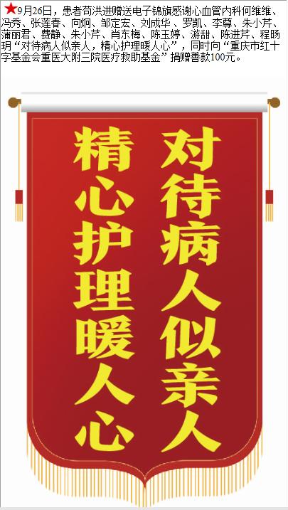 患者苟洪进赠送电子锦旗感谢心血管内科何维维等人,并向医疗救助基金捐赠善款100元。-锦旗-患者心声-患者服务-重庆医科大学附属第三医院【官方网站】