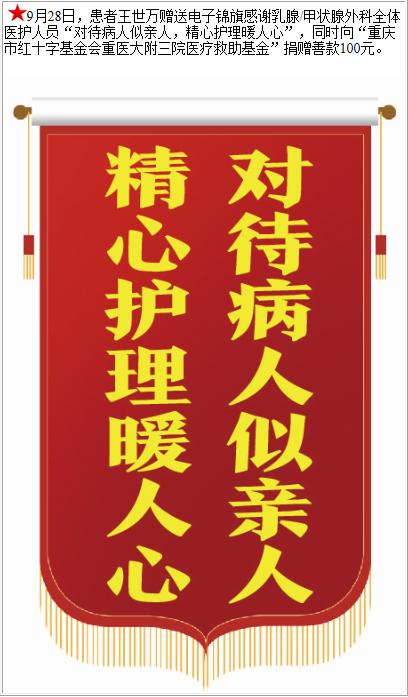 患者王世万赠送电子锦旗感谢乳腺/甲状腺外科全体医护人员,并向医疗救助基金捐赠善款100元。-锦旗-患者心声-患者服务-重庆医科大学附属第三医院【官方网站】