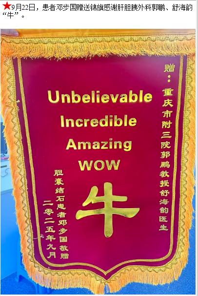 患者邓步国赠送锦旗感谢肝胆胰外科郭鹏等人。-锦旗-患者心声-患者服务-重庆医科大学附属第三医院【官方网站】