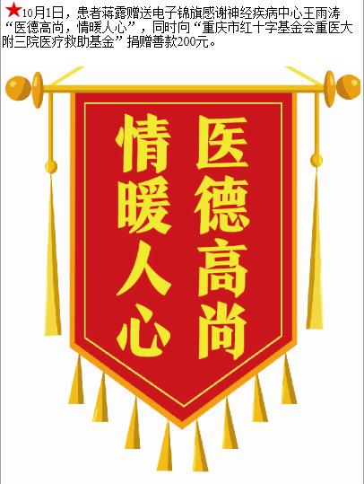 患者蒋露赠送电子锦旗感谢神经疾病中心王雨涛,并向医疗救助基金捐赠善款200元。-锦旗-患者心声-患者服务-重庆医科大学附属第三医院【官方网站】