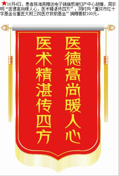 患者陈海英赠送电子锦旗感谢妇产中心胡珊等人,并向医疗救助基金捐赠善款100元。-锦旗-患者心声-患者服务-重庆医科大学附属第三医院【官方网站】
