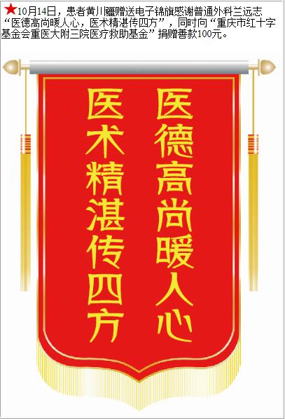 患者黄川疆赠送电子锦旗感谢普通外科兰远志,并向医疗救助基金捐赠善款100元。-锦旗-患者心声-患者服务-重庆医科大学附属第三医院【官方网站】