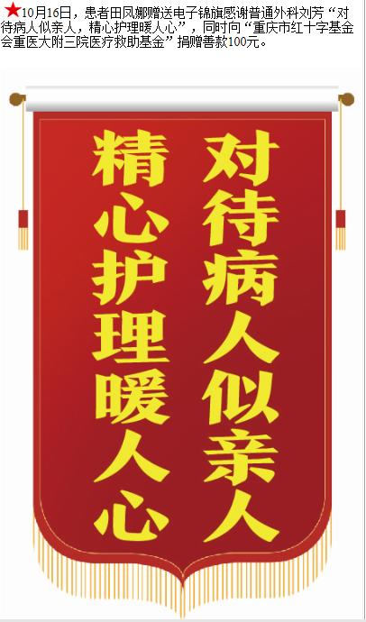 患者田凤娜赠送电子锦旗感谢普通外科刘芳,并向医疗救助基金捐赠善款100元。-锦旗-患者心声-患者服务-重庆医科大学附属第三医院【官方网站】