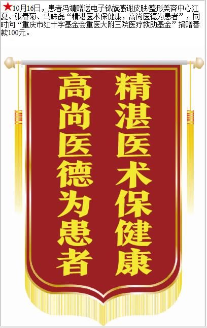 患者冯靖赠送电子锦旗感谢皮肤/整形美容中心江夏等人,并向医疗救助基金捐赠善款100元。-锦旗-患者心声-患者服务-重庆医科大学附属第三医院【官方网站】