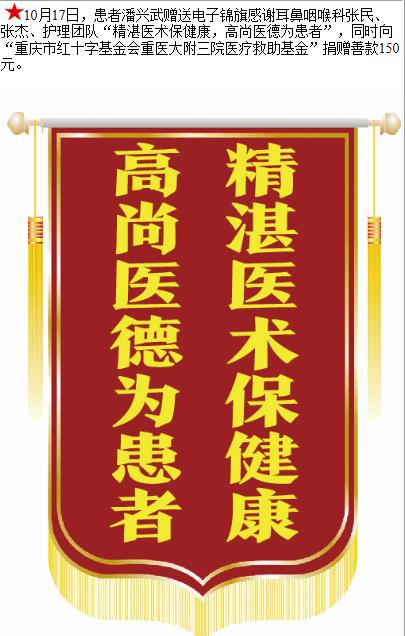 患者潘兴武赠送电子锦旗感谢耳鼻咽喉科张民等人,并向医疗救助基金捐赠善款150元。-锦旗-患者心声-患者服务-重庆医科大学附属第三医院【官方网站】
