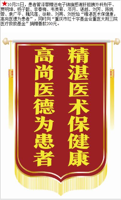 患者管泽蓉赠送电子锦旗感谢肝胆胰外科别平等人,并向医疗救助基金捐赠善款200元。-锦旗-患者心声-患者服务-重庆医科大学附属第三医院【官方网站】