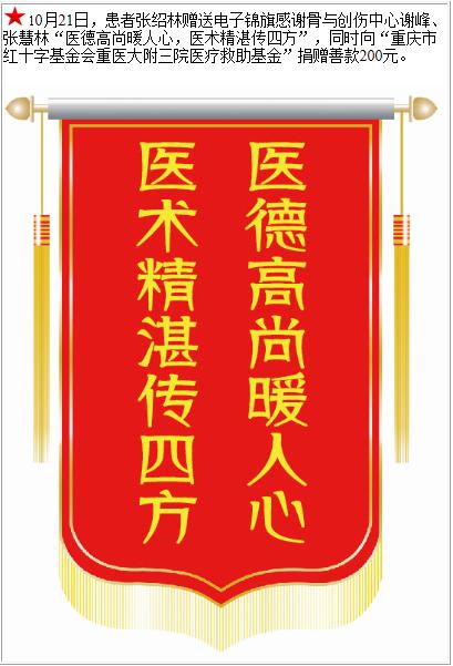 患者张绍林赠送电子锦旗感谢骨与创伤中心谢峰等人,并向医疗救助基金捐赠善款200元。-锦旗-患者心声-患者服务-重庆医科大学附属第三医院【官方网站】