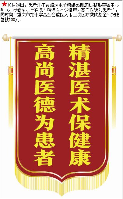 患者汪星灵赠送电子锦旗感谢皮肤/整形美容中心郝飞等人,并向医疗救助基金捐赠善款100元。-锦旗-患者心声-患者服务-重庆医科大学附属第三医院【官方网站】